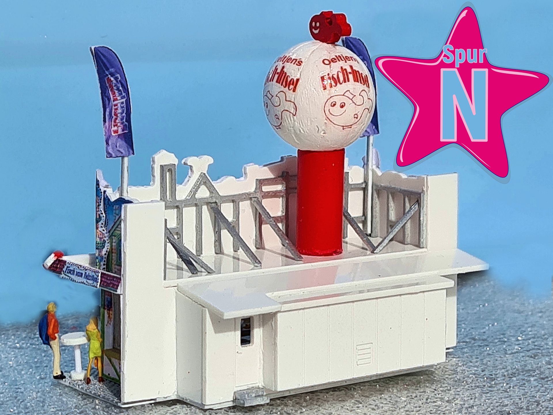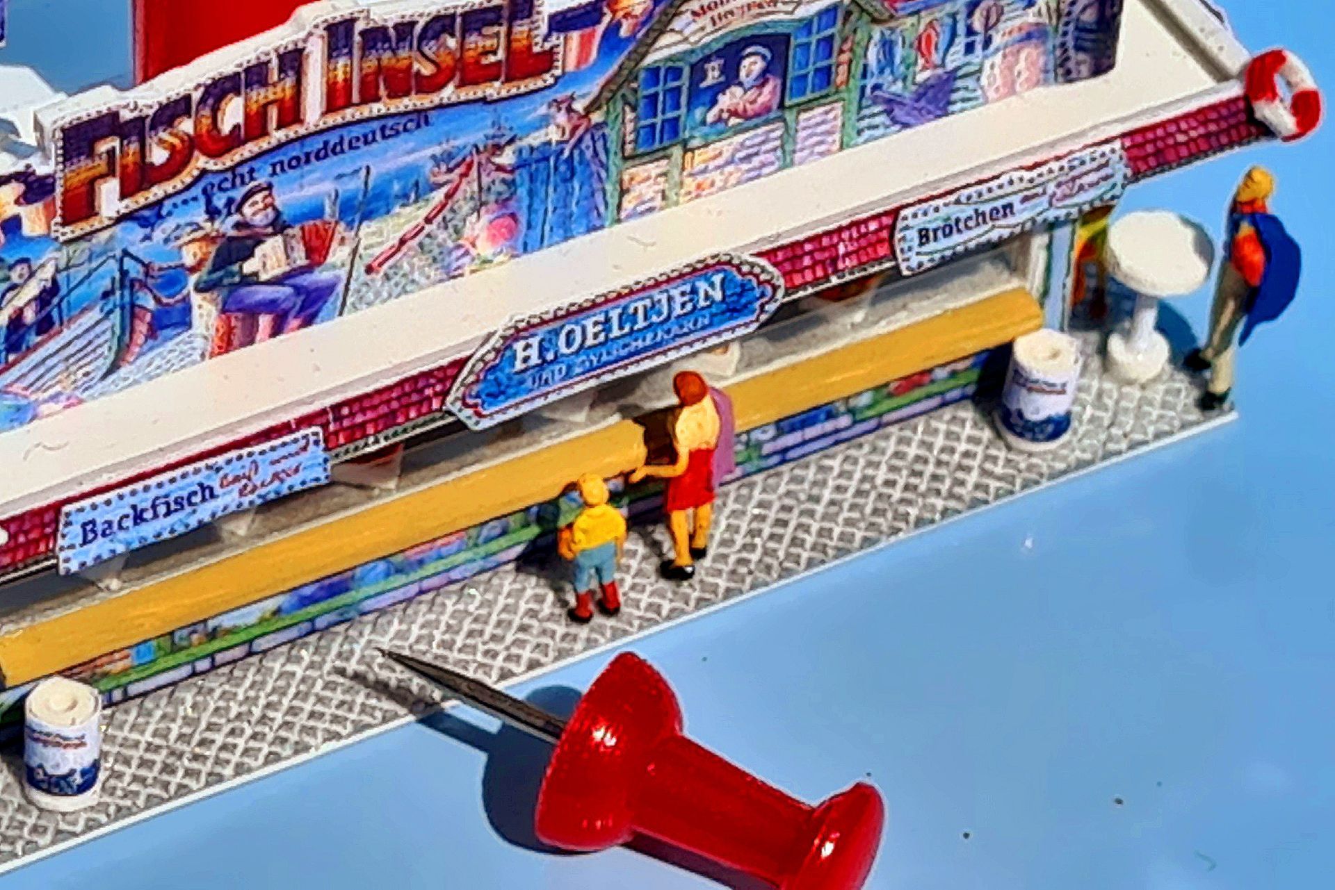 Farbenfroher, vorbildgetreuer Nachbau des Reihengeschäfts "Fischinsel", im Original von der Firma H. Oeltjen + Co aus Bremen.