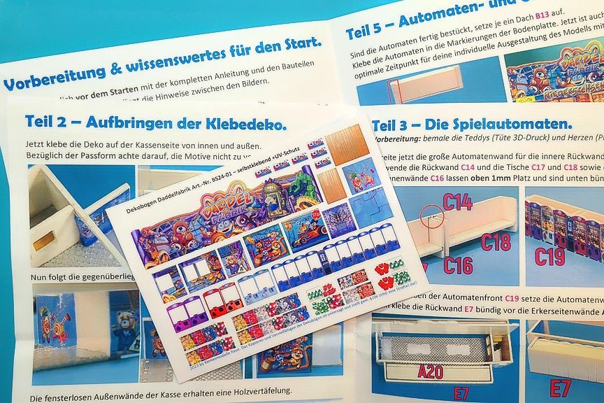 Zur Ausgestaltung der Kasse gehört neben dem Ecktresen jetzt auch ein höhenverstellbarer Gamingstuhl für den Kassierer und eine vorbildgetreue Wandverkleidung. Zum Lieferumfang gehören 20 liebevoll gezeichneten Teddys aus dem 3D-Druck für die Frontautomaten und 20 Herzkissen für die seitlichen Automaten.