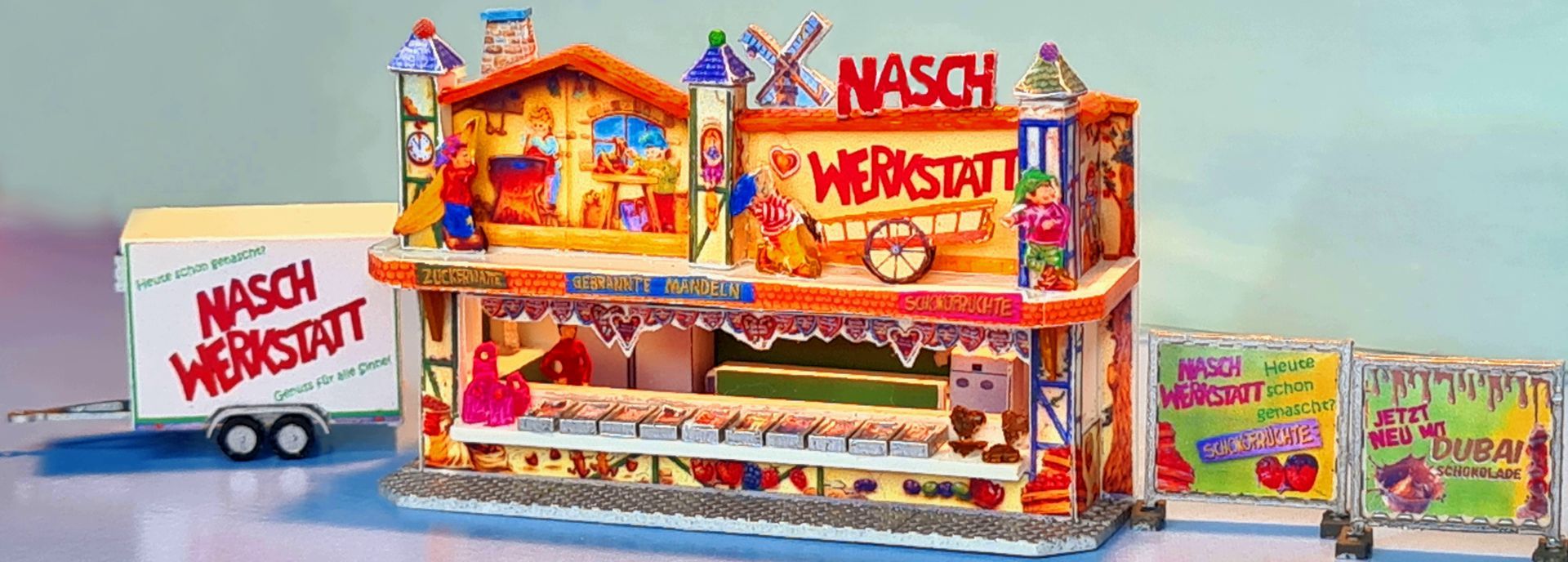 Es handelt sich um ein detailreiches Reihengeschäft, im Original von der Familie Hickmann, bekannt von vielen großes Festplätzen wie z.B. der Cranger Kirmes oder der Eisleber Wiese.